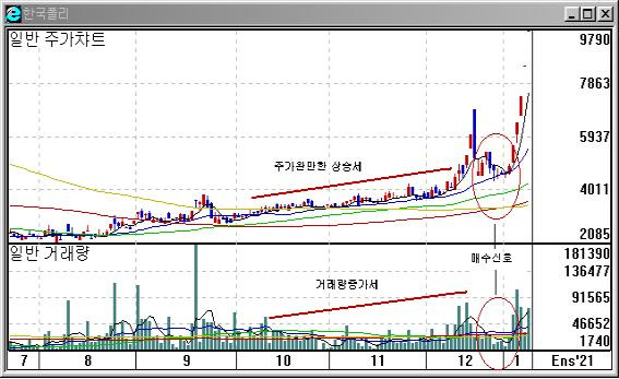 ⑦ 주가가 완만한 속도로 증가하지만 거래량이 꾸준히 증가하고 있으면 매수세가 지속되고 있다는 신호입니다.