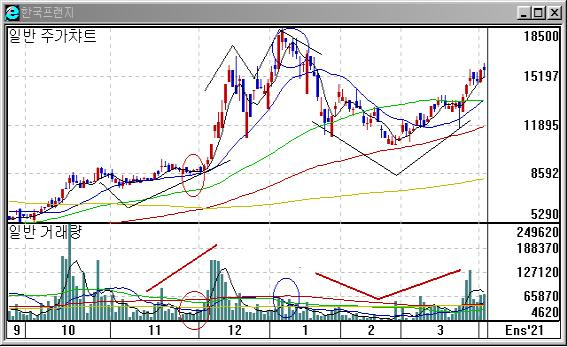감소추세를 보이던 거래량이 증가하기 시작하면 조만간에 주가상승이 예상되고 반대로 증가세를 보이던 거래량이 감소하기 시작하면 조만간에 주가하락이 예상됩니다. 또한 주가가 큰폭으로 상승한 이후 주가의 지속적인 상승에도 불구하고 거래량이 감소하기 시작하면 조만간에 천정권이 예상되고, 반대로 주가가 큰폭으로 하락한이후 주가의 지속적인 하락에도 불구하고 거래량이 증가하기 시작하면 조만간에 바닥권이 예상되기도 합니다.
