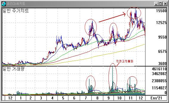 ④ 직점고점의 거래량을 상회하지 못하면 주가는 크게 상승할 수 없지만, 반대로 직전고점의 거래량을 상회하면 주가는 직점 고점을 상향 돌파할 수 있습니다.
