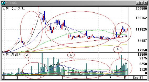 위의 그림에서 가와 다는 거래량이 증가하면서 장기, 단기 거래량 이동평균선이 정배열 상태를 보이면서 주가가 상승추세를 나타내고 있으며, 나는 거래량이 감소하면서 단기. 장기 거래량 이동평균선이 역배열상태를 보이면서 주가가 하락추세를 보이고 있슴.