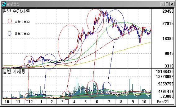위의 그림에서 적색원의 영역과 같이 거래량 장기. 단기 이동평균선이 골든크로스가 발생할 경우에는 매수시점으로, 청색원의 영역과 같이 데드크로스가 발생할 경우에는 매도시점으로 활용할 수가 있습니다.